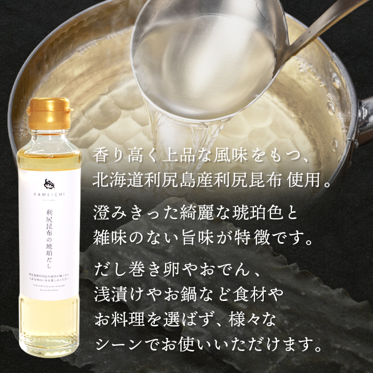 澄んだ琥珀色と、すっきりとした旨味が特徴です。だし巻き卵やおでん・野菜の浅漬け・鍋のだしなど、食材や料理を選ばず、様々なお料理にお使いいただけます。